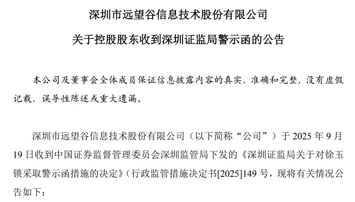 远望谷控股股东徐玉锁涉违规操作,深圳证监局发出警示函——股市震荡下的股东权益变动风险揭秘 远望谷控股股东徐玉锁因涉持股变动违规收到深圳证监局警示函,据相关法规,股东在持股变动时需依法依规进行披露和报告,违规行为可能导致公司股价波动,损害其他投资者利益,此事件提醒投资者关注公司股权结构变动及其合规性,维护市场公平与秩序。...