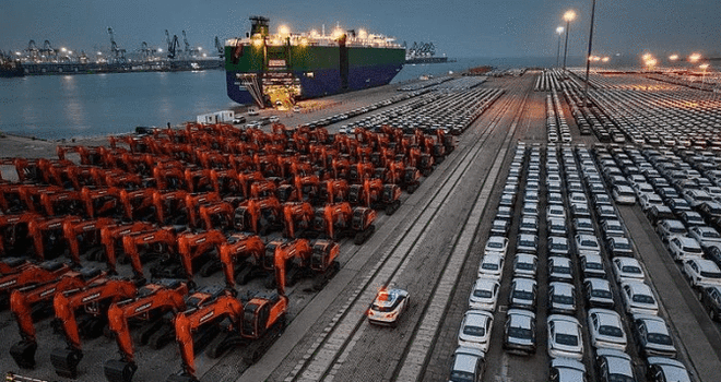 图为港口上整齐排放的中国电动汽车
