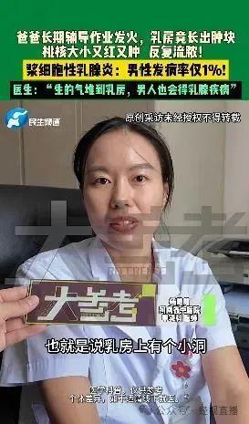 一位父亲辅导孩子作业时因情绪波动引发乳腺炎,胸部出现红肿、流脓等症状,经过医生检查,发现胸部已经“破了一个洞”,这种情况需要及时就医治疗,避免病情加重,提醒广大家长,关注自身情绪健康,避免过度焦虑和压力,预防类似疾病的发生。