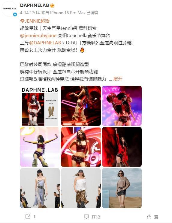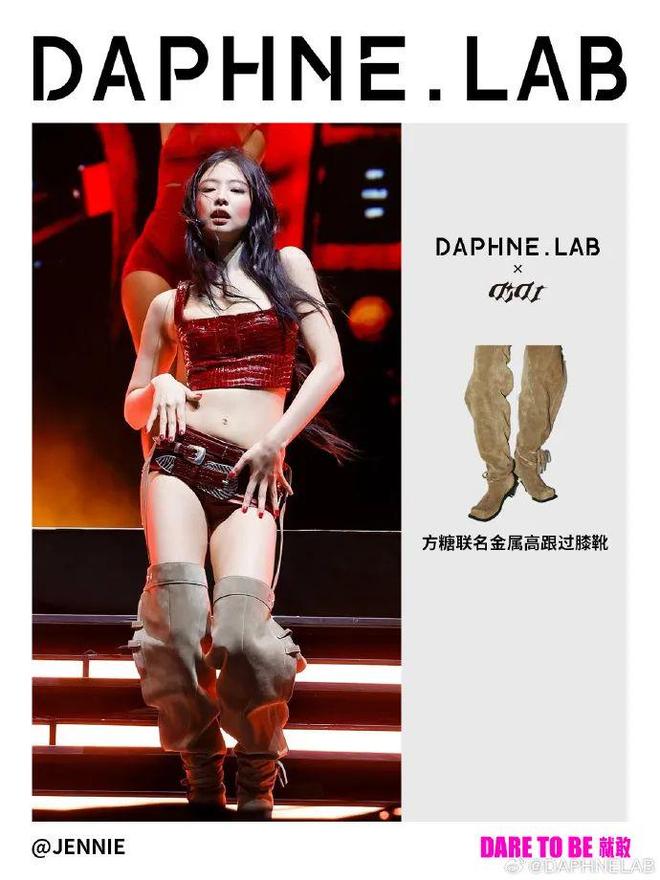 有眼尖网友发现,Jennie穿的靴子疑似是达芙妮旗下先锋设计子品牌DAPHNELAB与中国设计师品牌DIDU的联名合作款。值得一提的是,Jennie早在今年4月在美国参加音乐节表演时就曾穿过这双靴子。DAPHNELAB官方微博随后也发布了相关宣传内容。