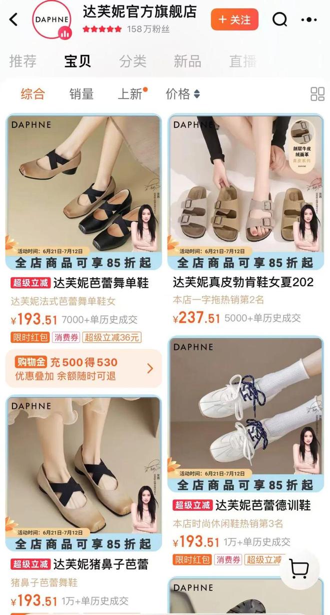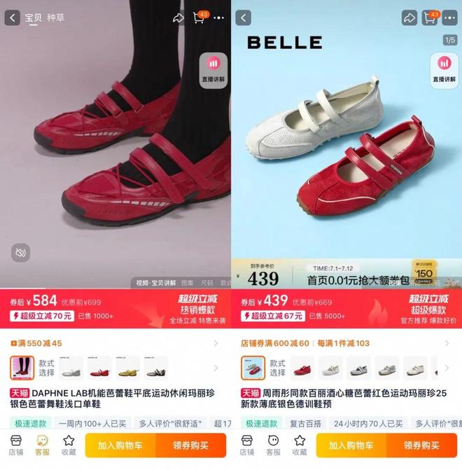 更大的忧患来自竞争。以天猫DAPHNELAB旗舰店销量第一的芭蕾运动鞋为例,百丽相似款券后价格439元,已售为5000+双。