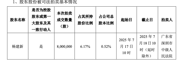 跨境通公告称,公司第一大股东杨建新所持800万股股份(占其所持股份比例6.17%,占公司总股本比例0.52%)于2025年7月17日至18日公开拍卖,已竞价成功。
