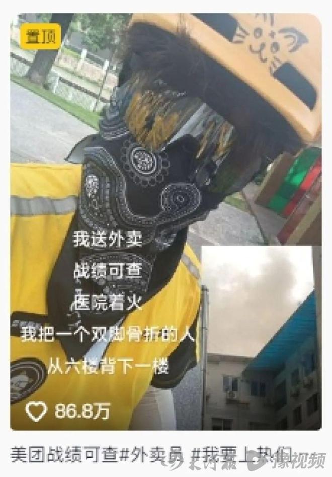 近日,四川成都一外卖员在社交平台发文:“我送外卖战绩可查,我把一个双脚骨折的人从6楼背下1楼。”配文视频点赞80余万,浏览量1000多万。