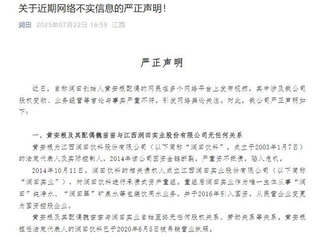 润田实业表示,自称润田创始人黄安根配偶的网民在网络上持续散布涉及公司的不实言论,严重损害了公司品牌形象和市场声誉,对公司的正常生产经营造成了较大负面影响,对此,公司将依法依规对不实言论发布者追究法律责任。