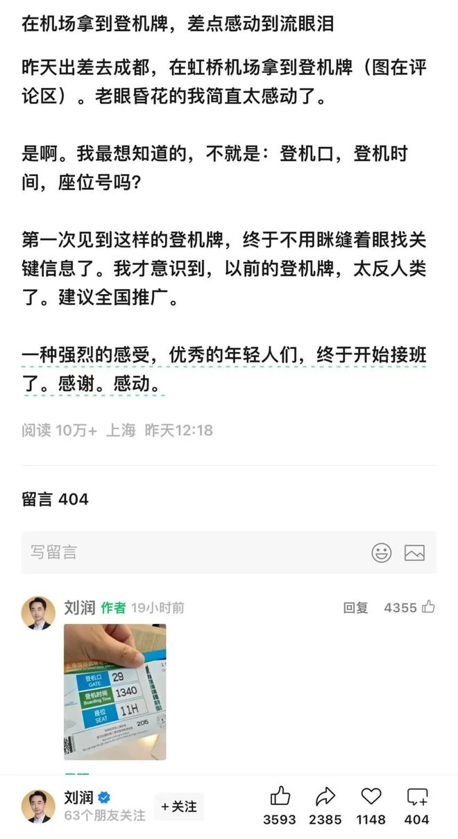 小小一张登机牌引起了网友的众多关注和热烈讨论,短短数小时内,刘润的这篇短文不仅阅读量10万+,也收获了很多点赞、转发、收藏。
