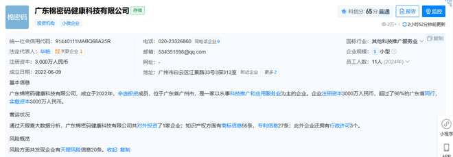 天眼查信息显示,广东棉密码健康科技有限公司成立于2022年,辛选投资成员,位于广东省广州市,是一家以从事科技推广和应用服务业为主的企业。企业注册资本3000万人民币。