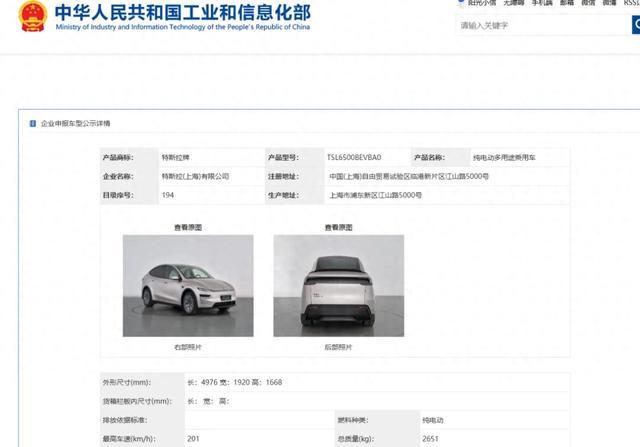 7月16日,工业和信息化部在官网公布第397批《道路机动车辆生产企业及产品公告》,特斯拉纯电动多用途乘用车名列其中。信息显示,该产品为6座车型,车长为4976mm。