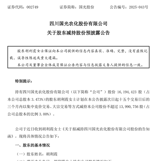 微成都报道7月25日,国光股份(002749.SZ)公告称,股东胡利霞计划在本公告披露次日起十五个交易日后的三个月内,以集中竞价、大宗交易等方式减持公司股份不超过1399.08万股,占公司总股本的3%。
