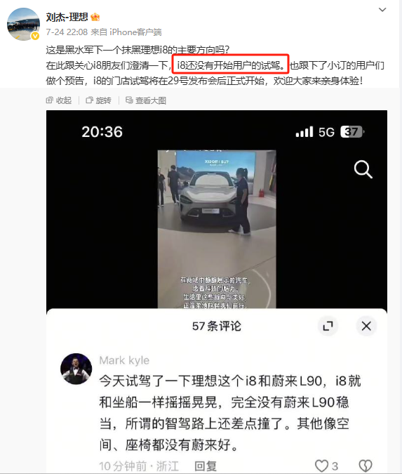 7月24日晚,认证为“理想汽车副总裁”的微博用户“刘杰-理想”发布微博,并配了一位网友的评论截图,“这是黑水军抹黑理想i8的下一个主要方向吗?在此跟关心i8朋友们澄清一下,i8还没有开始用户的试驾。”