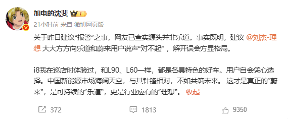 沈斐还称,网友已查实源头非蔚来乐道。事实既明,建议刘杰大大方方向乐道和蔚来用户说声“对不起”,解开误会方显格局。