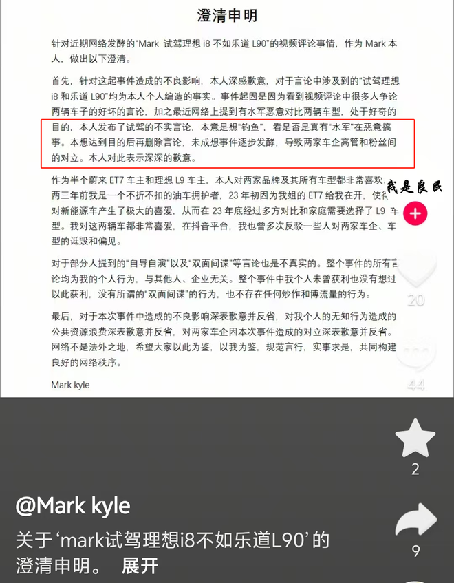 “本意是想‘钓鱼’,看是否是真有‘水军’在恶意搞事。本想达到目的后再删除言论,未成想事件逐步发酵,导致两家车企高管和粉丝间的对立。本人对此表示深深的歉意。”该网友称,在整个事件中,他的所有言论均为个人行为,与其他人、企业无关。