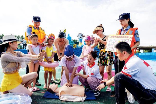 2024年7月7日,江苏泰州市一处水上乐园,红十字应急救援队志愿者利用仿真人模型向家长和儿童介绍心肺复苏法。图/视觉中国
