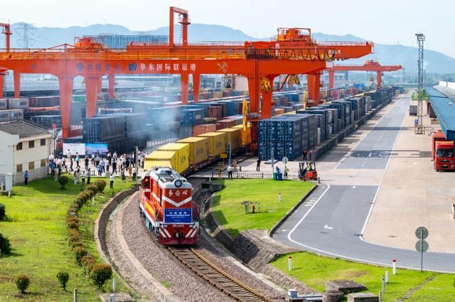 6月18日,浙江金华市华东国际联运港,全国首趟“金华-巴希-巴库”跨里海国际运输走廊中欧班列从铁路金华南站鸣笛启程。图/中新
