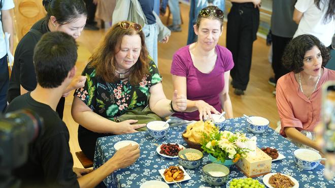△7月25日,益阳清溪村,汉学家们品尝擂茶等特色小吃。
