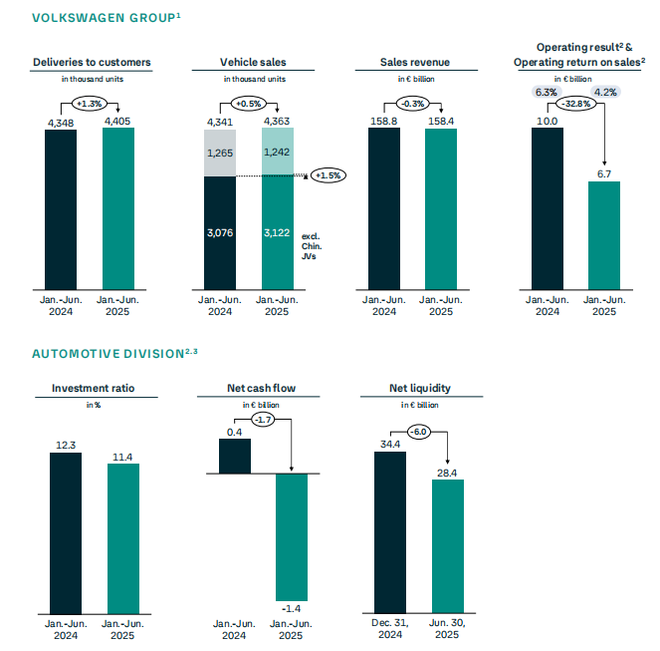 大众汽车集团首席财务官Arno Antlitz表示,“我们的半年数据呈现出一幅对比鲜明的画面:一方面,我们取得了强劲的产品成功,并在公司重组方面取得了进展。另一方面,经营业绩同比下降了三分之一,这也是由于利润率较低的全电动车型的销量增加。此外,美国进口关税的增加和重组措施也产生了负面影响。不包括这些项目,第二季度的营业利润率接近7%,代表了我们预期的上限。这表明我们走在正确的轨道上。但真正重要的是银行的现金。这就是为什么我们必须继续推进我们正在进行的计划,以提高收益,并在必要时加快步伐。”
