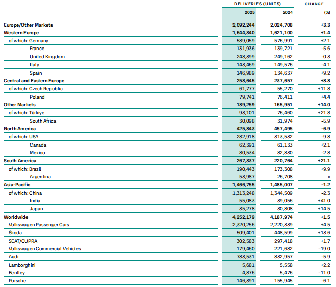 2025年上半年,大众汽车集团在全球范围共销售乘用车与轻型商用车425.2万辆,其中欧洲与其他地区209.2万辆,同比增长3.3%;北美地区42.58万辆,同比减少6.9%;南美地区26.73万辆,同比增长21.1%;亚太地区146.68万辆,同比减少1.2%,其中在中国同比减少2.3%至131.32万辆。