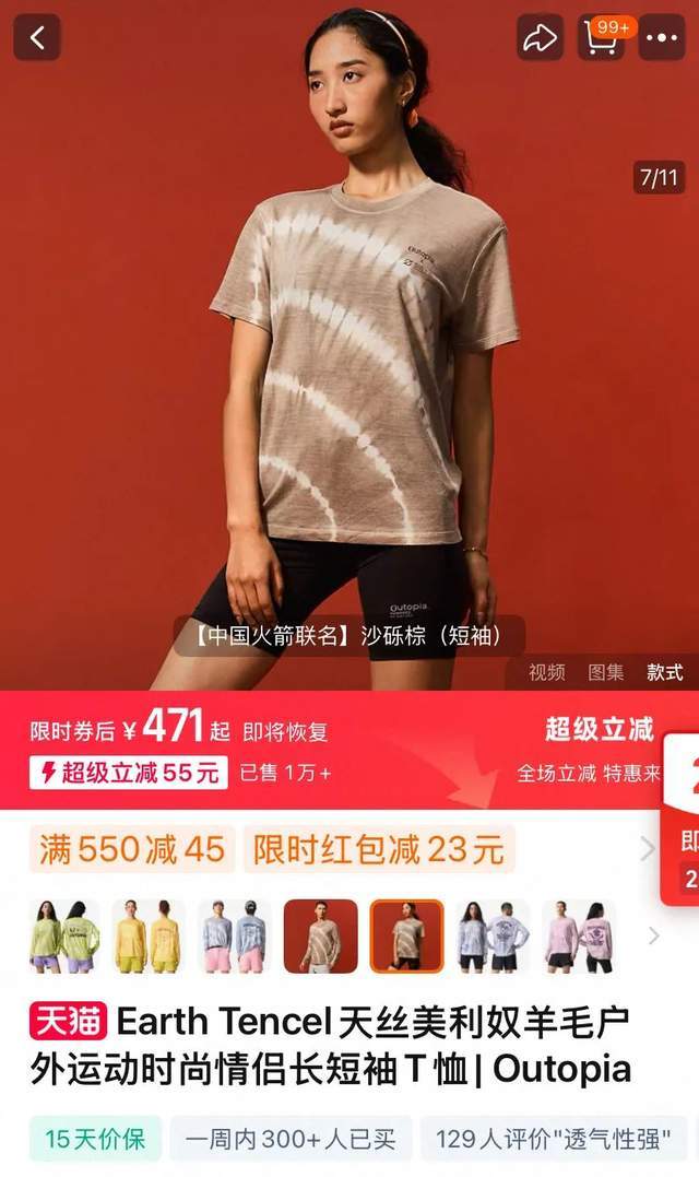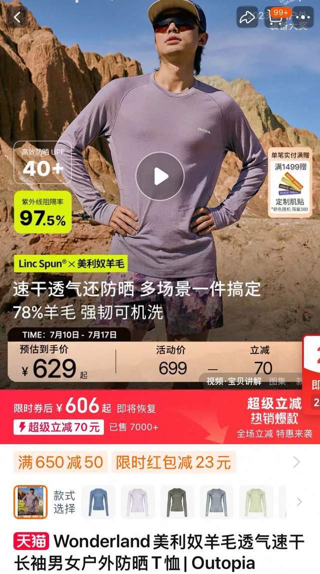 新锐品牌也不甘示弱,2021年成立的越野跑品牌outopia同样主打羊毛面料,去年“618”拿下天猫速干背心、皮肤衣两个细分类目第一。在天猫outopia旗舰店,一款六百元出头的户外防晒T恤,标注“78%羊毛”,单链接售出7000+,历史成交超2万单。
