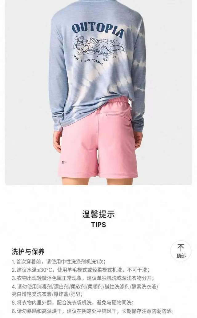 以outopia美利奴羊毛短袖T恤为例,虽然标榜“可机洗”,但护理指南中“使用羊毛模式或轻柔模式”“单独机洗或深浅衣物分开”“勿使用柔软剂/柔顺剂/肥皂”“将衣物内里外翻,配合洗衣袋机洗”等字样,仍在提醒消费者:这终究不是一件可以随意对待的基础款。