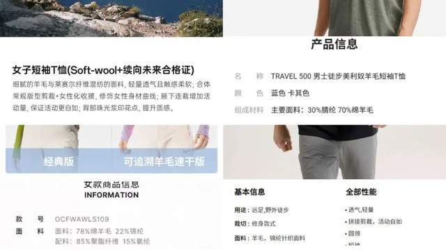 映射到品牌,不少户外运动品牌都推出了羊毛混纺产品:迪卡侬有30%腈纶与70%绵羊毛混纺的短袖T恤;安踏冠军徒步系列女子短袖T恤融合了40%绵羊毛、60%莱赛尔;始祖鸟、outopia选择羊毛与锦纶混纺。在相关产品介绍中,舒适、耐穿、耐洗、快干等卖点常被提及。