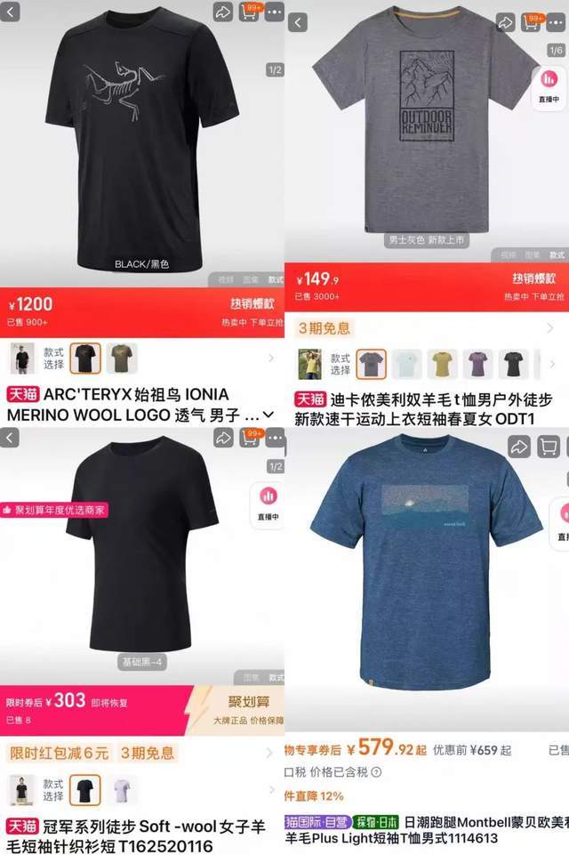 非专业羊毛品牌也在加速布局。从始祖鸟、montbell到迪卡侬、安踏,各大运动品牌的天猫旗舰店都能找到羊毛短袖的身影。其中迪卡侬的速干羊毛T恤已售出3000+件,montbell羊毛T恤热门笔记互动量超1600条。这股“反季节”的羊毛风潮正在向更广阔的市场蔓延。