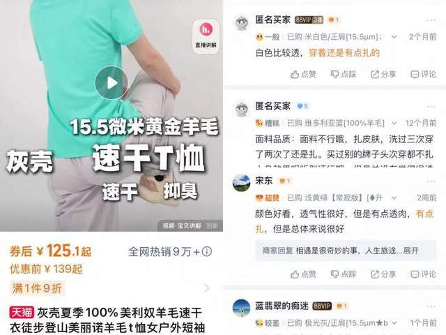 而在灰壳旗舰店全网热销9万+的羊毛短袖评论区,“扎肉”的抱怨虽不多见,却也无法忽视。
