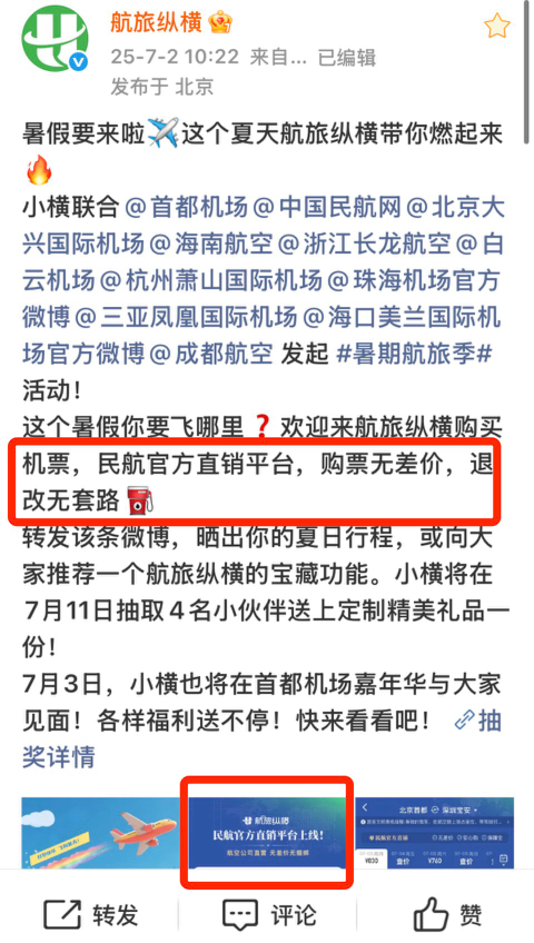 据有意思报告梳理,航旅纵横有关“民航官方直销平台”的提法首次出现于7月2日,粉丝量超过60万的航旅纵横官方微博借暑期活动强调其作为民航官方直销平台,“购票无差价,退改无套路”。之后,该标签开始频繁出现于其微博内容中。