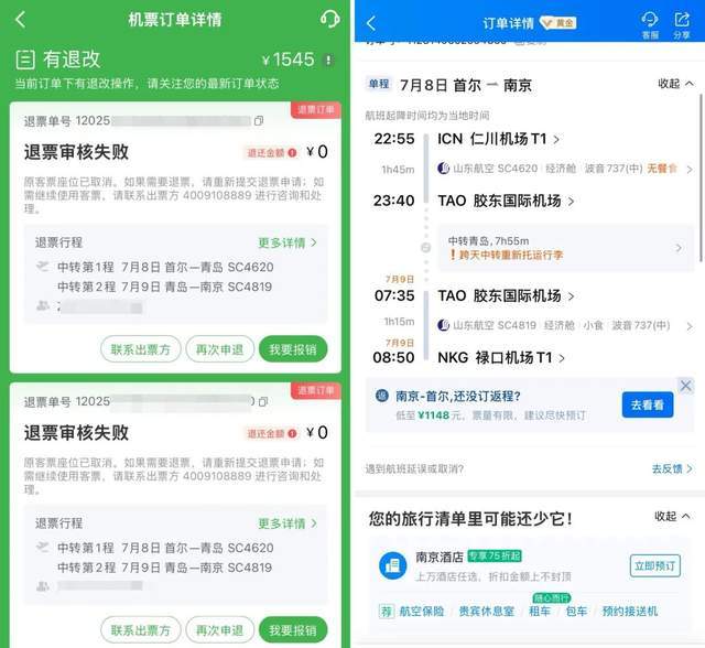 最终多次打电话与航旅纵横客服沟通后,她才要回了姗姗来迟的那张重复票的票钱。“客服很难找,好不容易联系上了,它又说它只是代理商,出票时间也在规定范围内,没办法给我解决。”