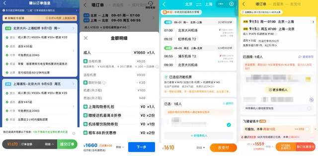 有意思报告也在8月2日午间以9月1日—5日北京往返上海行程为例,同时选取最早时间的东航、国航两趟航班,并在数次“婉拒”平台提供的诸如退票、改签、保险等服务选项后进行“裸价”对比,航旅纵横确实比支付价格最高的某平台价格还高出10元。