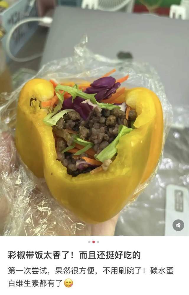 除了营养价值之外,彩椒的形状也是它“出圈”的原因:内部中空,切开就能变成一个“碗”,吃完之后也不需要洗碗。更妙的是,它内部空间大小刚好,装下的食物量基本能满足一顿饭的能量需求。