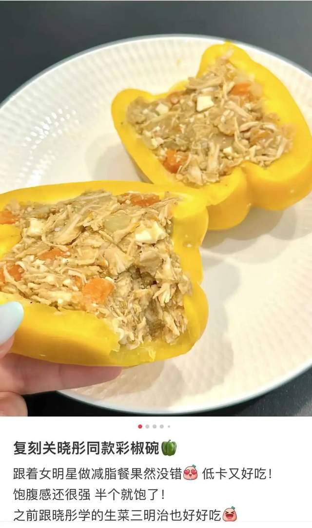 先是关晓彤晒了妈妈做的“夏日低卡彩椒碗”,以彩椒作为容器,填入鸡胸肉碎、土豆胡萝卜泥等食材,又清爽又顶饱,掀起“抄作业”潮。在小红书,“关晓彤同款”话题已经有2.5亿次浏览,其中彩椒碗出现频率尤其高。