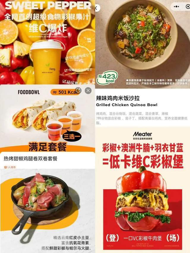 不少轻食餐厅的低脂餐中也有彩椒。SummerFeng鲜榨果汁推出彩椒菠萝橙子果汁;超级碗FOODBOWL有热烤甜椒鸡腿卷;Meater推出低卡维C彩椒堡。Wagas的帕尔马火腿配迷迭香以及gaga的辣味鸡肉米饭沙拉都含彩椒。