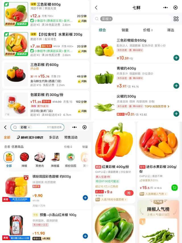 以北京某地区为例,在美团、七鲜超市、叮咚买菜、物美超市等线上平台搜索“彩椒”,美团、七鲜超市、叮咚买菜上均能买到三色彩椒,物美超市则只有红色彩椒和黄色彩椒。虽然不同地区的生鲜仓库备货可能有所差异,但总体而言,想要买到红、黄、绿这三种颜色的彩椒并不困难。
