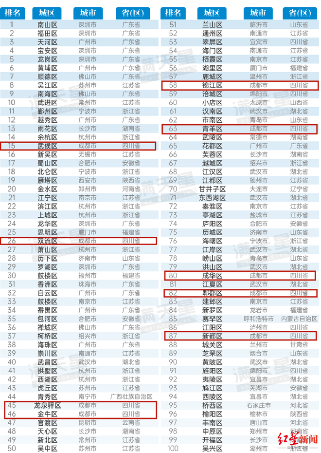其中成都有9个区上榜,上榜数量位居榜单中所有城市第一位,具体包括:武侯区、双流区、龙泉驿区、金牛区、锦江区、青羊区、成华区、郫都区、新都区。