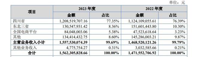 值得关注的是,菊乐股份是一家典型的区域性乳企。2019年—2020年,菊乐股份在大本营四川市场的营收占比超过90%,直到2020年10月收购黑龙江惠丰乳品有限公司(简称“惠丰乳品”)才真正打破销售区域过于集中的风险。据公开转让说明书,2023年其四川市场营收占比降至77.35%,东北三省市场营收占比为8.36%。