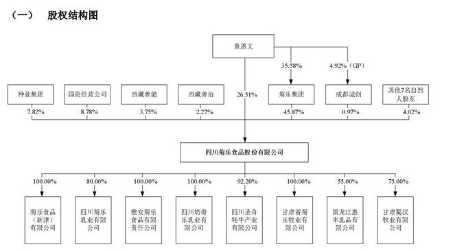 股权架构显示,成都菊乐企业(集团)股份有限公司(简称“菊乐集团”)系公司的控股股东,其直接持有公司45.87%的股权。董事长童恩文系公司实际控制人。