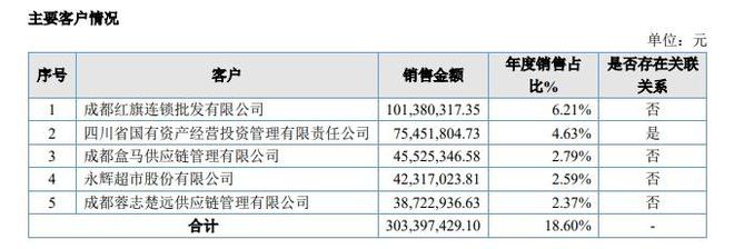 公司前五大客户包括成都红旗连锁批发有限公司、四川省国有资产经营投资管理有限责任公司、成都盒马供应链管理有限公司等,去年年度销售占比分别为6.21%、4.63%、2.79%。