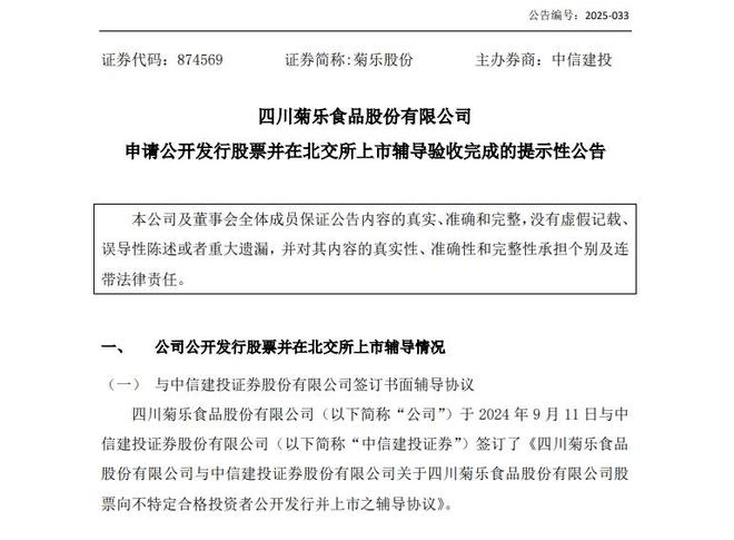 微成都报道6月24日,四川菊乐食品股份有限公司(简称“菊乐股份”,874569)发布《申请公开发行股票并在北交所上市辅导验收完成的提示性公告》,宣布其北交所上市辅导验收通过,正式获得IPO申报资格。