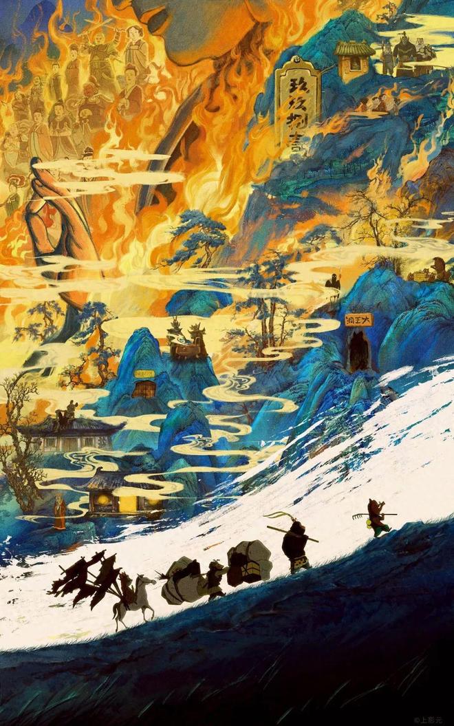 如今观众眼前的画面,无论松石、远山还是村庄,无不充满古意,景物是水墨氤氲的山川云气,人物又是工笔勾勒的精细国画。在笔墨意韵中,加进了现代绘画中的光影、色彩和空间透视,二者交融弥合,在古与今、神话和现实、作者与大众之间找到了一条中间道路。陈廖宇发明了一个词叫“水墨意镜”——不是用镜头表现一幅画,而是在镜头里加入画意。这背后,是600多人团队、1800多组镜头和2000余张场景手绘,实现了“大处写意,小处写实”。