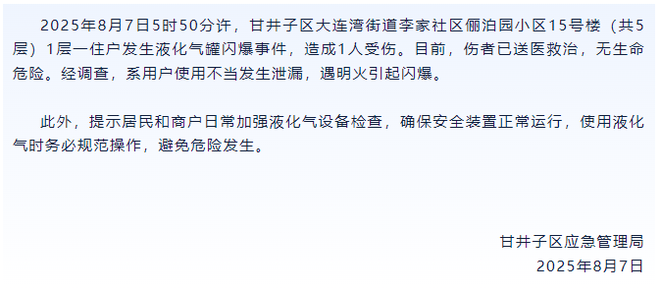 2025年8月7日5时50分许,甘井子区大连湾街道李家社区俪泊园小区15号楼(共5层)1层一住户发生液化气罐闪爆事件,造成1人受伤。目前,伤者已送医救治,无生命危险。经调查,系用户使用不当发生泄漏,遇明火引起闪爆。