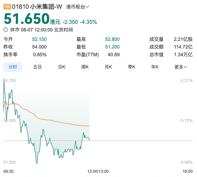8月7日,小米集团-W(1810.HK)盘中一度跌超5%,股价创近两个月新低。截至午间收盘,小米集团跌4.35%,报51.65港元。