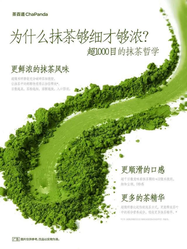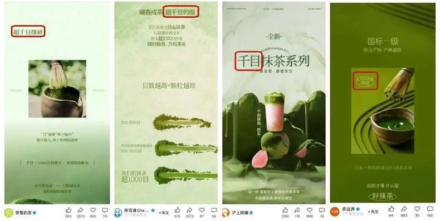 奈雪的茶的“浓抹香水椰”“浓抹黑珍珠”,茶百道的“浓抹奶冻”“浓抹米乳青团”,沪上阿姨的千目抹茶芭乐,以及茶话弄的“青云浓抹”等产品,均标榜使用千目或超千目规格的抹茶粉。“千目”“浓抹”成了各大品牌争相强调的卖点,还被直接写入产品名称,以此突出其高浓度、高品质的抹茶风味。