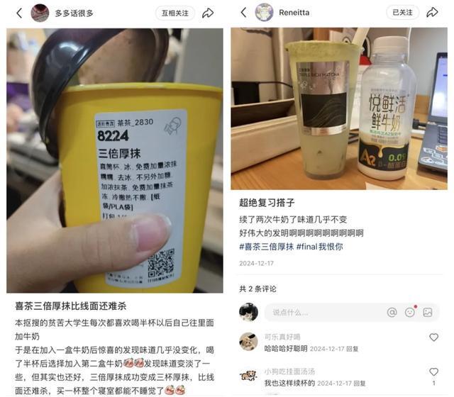 此番,有网友在社交平台发文称,手里的三倍厚抹喝完一半,再兑满水或牛奶后口感仍然浓郁。甚至有大学生网友调侃,买一杯三倍厚抹,整个宿舍都能喝饱。
