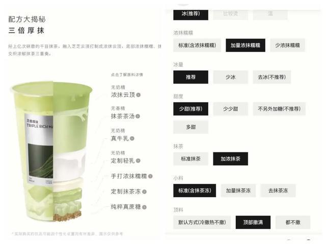而据喜茶小程序查询,除以上三重抹茶之外,消费者还可以选择在顶部再撒一层抹茶粉,并将抹茶、抹茶冻和浓墨糯糯换成加浓加量版本。也就是说,满打满算起来,一杯三倍厚抹甚至可以囊括五重抹茶元素。