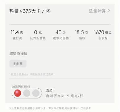 但是,浓抹茶饮的咖啡因和茶多酚含量同样也较高。喜茶点单小程序喜茶GO页面显示,三杯厚抹为咖啡因红灯饮品,每杯中的咖啡因含量约为161.5毫克,茶多酚含量约为1670毫克。