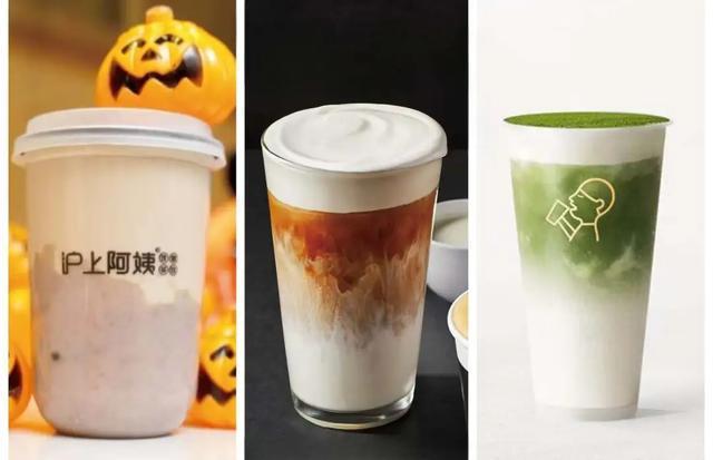 (左至右)厚芋泥波波奶茶、海盐芝士厚乳拿铁、咸酪厚抹|图源:(左至右)沪上阿姨、瑞幸咖啡、喜茶