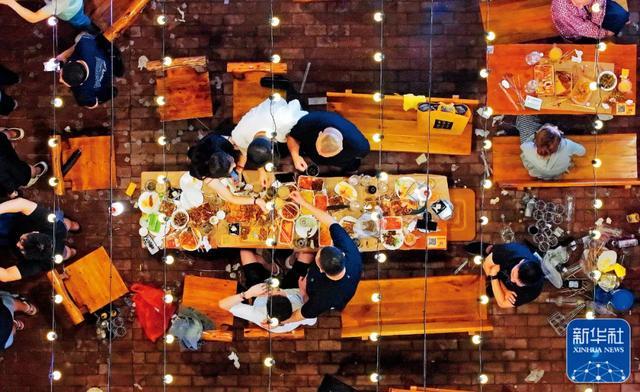 2025年7月5日,在第二十三届哈尔滨国际啤酒节现场,游客在啤酒花园里喝啤酒品美食。图/新华