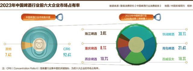当下,中国啤酒市场已然步入成熟阶段,行业竞争格局业已基本稳固成形。根据企业啤酒业务营收数据呈现,2023年中国啤酒行业前六大企业的市场占有率达到了92.6%。这意味着前六大啤酒企业几乎把控了整个市场。