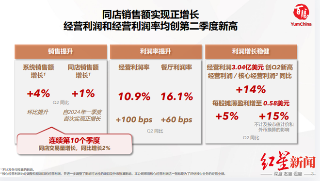 第二季度,百胜中国的总收入达到28亿美元,不计及外币影响,同比增长4%。在第二季度净新增超过300家门店的基础上,公司实现同店销售额转正,同比增长1%;同店交易量已连续十个季度实现增长; 系统销售额,按季度增长2个百分点,同比增长4%。在去年高基数的基础上第二季度经营利润同比增长100个基点,至10.9%。