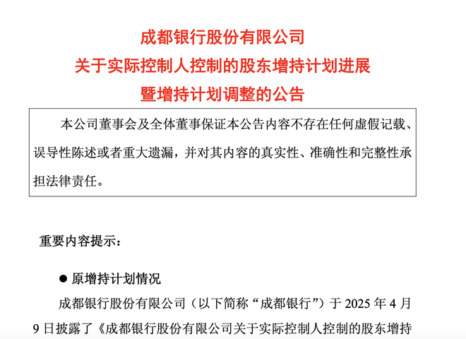 公告称,4月9日,成都银行披露了《成都银行股份有限公司关于实际控制人控制的股东增持计划公告》,成都银行实际控制人成都市国资委实际控制的企业成都产业资本控股集团有限公司(以下简称“成都产业资本集团”)、成都欣天颐投资有限责任公司(以下简称“成都欣天颐”),拟自2025年4月9日起6个月内,通过上海证券交易所系统以集中竞价等合法合规方式增持成都银行A股普通股股份。