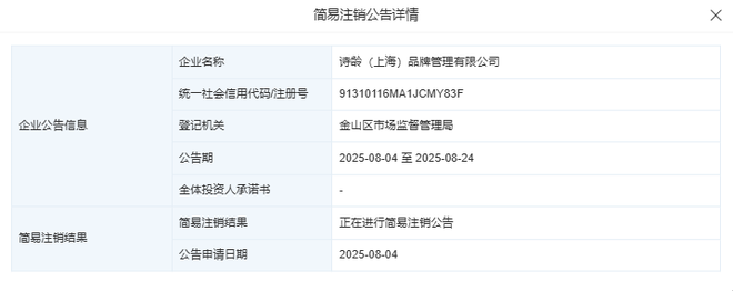 8月9日消息,天眼查APP显示,诗龄(上海)品牌管理有限公司(下称“诗龄品牌公司”)正在进行简易注销,公告期为8月4日至8月24日。